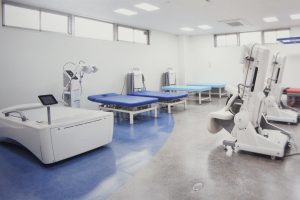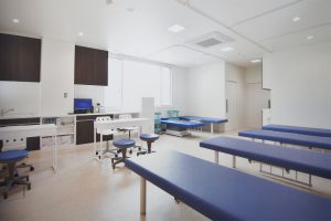 関節注射、血管注射、採血、神経ブロック後経過観察などに使用します。7台の簡易診察ベットを稼働しています。縫合などの処置もここで行います。処置室にはギプス除去後の足洗い場なども設置しています。