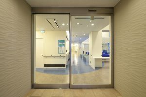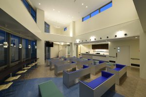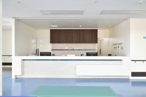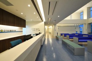 待合室は病院くささを減らし、明るい雰囲気をだすため、吹き抜けとし前面をガラス張りとしています。調度品は座り心地はもちろんのこと、色も明るい空や海をイメージしています。カウンターテーブルには自由に使えるLANと電源コンセントを常備しています。また待合室はFree WiFi環境を提供しています。